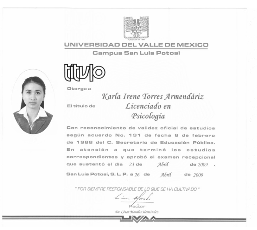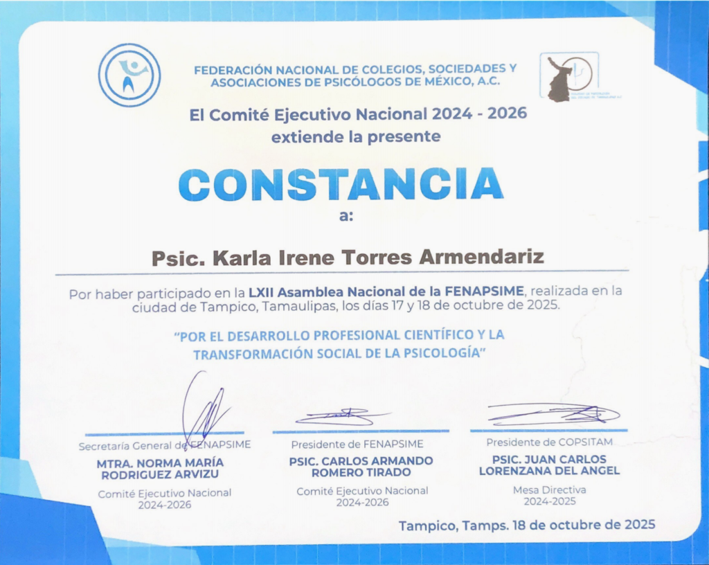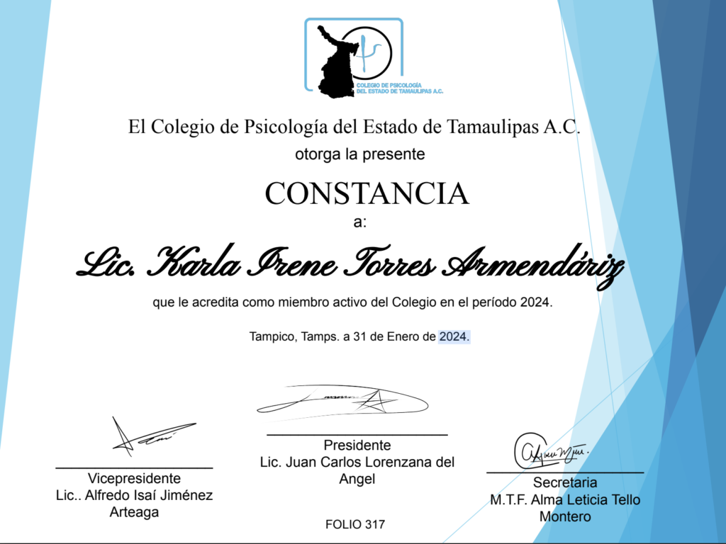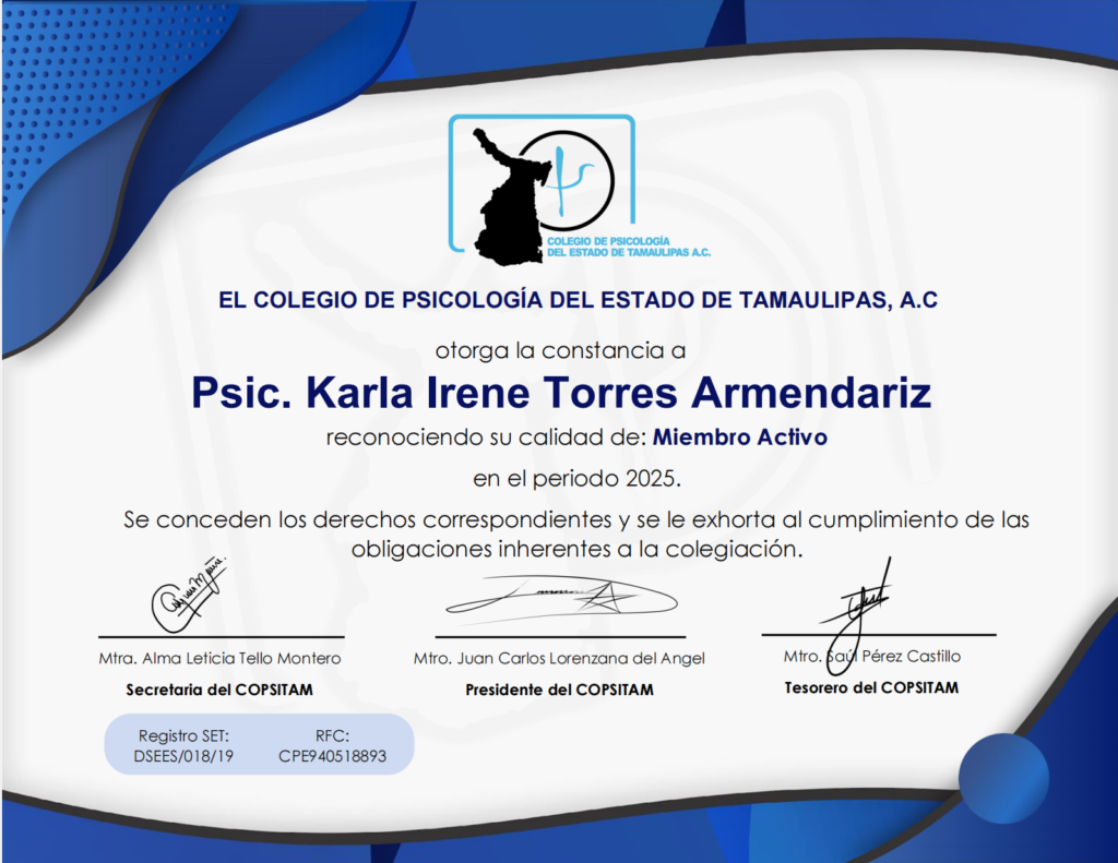 Soy licenciada en psicóloga clínica desde el año 2009 (C. 6283067) por la Universidad del Valle de México (San Luis Potosí) y maestra en terapia familiar (C. 7971415) desde el 2012, por la Universidad del Noreste (Tamaulipas). He trabajado en el Tecnológico Nacional de México, atendiendo a estudiantes, principalmente, en asesoría psicológica, impartiendo cursos de Desarrollo Humano, y coordinando diversas actividades que promueven el bienestar psicológico durante sus estudios universitarios. También he impartido asignaturas de enfoque psicológico en dicha institución y en la Universidad del Valle de México. Soy miembro del Colegio de Psicología del Estado de Tamaulipas A.C. Mi más reciente logro ha sido trasladar mi servicio de psicoterapia (desde el 2012), que fue presencial durante años, a la modalidad en línea, debido a las medidas de prevención por la contingencia (2020). Además, trabajé como asesora emocional vía telefónica en la empresa Servicios Orienta (Querétaro) durante el primer año de la pandemia.